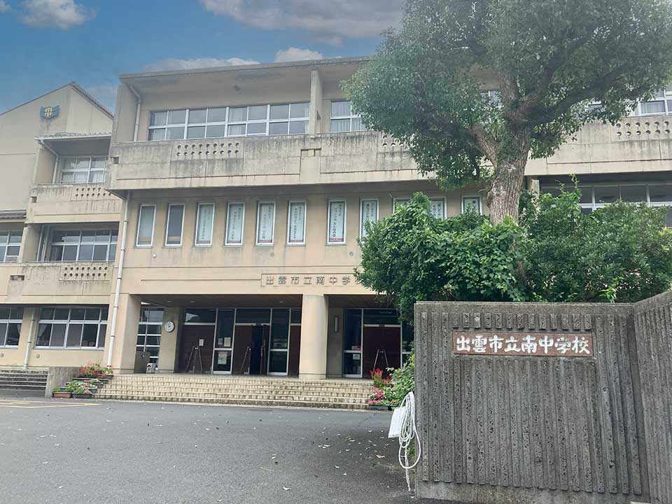 『出雲市立南中学校』は朝山町にある中学校です。山間にある敷地の南西側に稗原川が流れ、西方向に国道184号が通っています。北方向には県道51号出雲奥出雲線が通っています。学校教育目標は「心身ともに強くたくましく、思いやりの心をもち、創造力豊かな生徒の育成」。「心身ともに強くたくましい生徒」「自他を尊重し、感謝と思いやりの心をもつ生徒」「主体的に考え、創造性豊かな生徒」などの育成を目指しています。