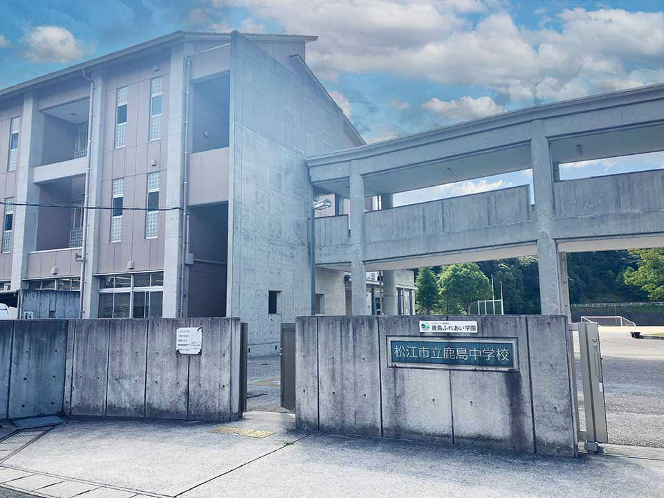 『松江市立鹿島中学校』は鹿島町名分にある中学校です。敷地の西方向に県道37号松江鹿島美保関線が通り、佐陀川が流れています。また東方向には県道264号講武古江線が通り、講武川が流れています。近隣には「鹿島武道館」が位置しています。1958年(昭和33年)に開校しました。学校教育目標として「『確かな学力』『豊かな人間性』『健やかな体』をもち 地域に根ざし、力強く未来を切り拓く生徒の育成」を掲げています。