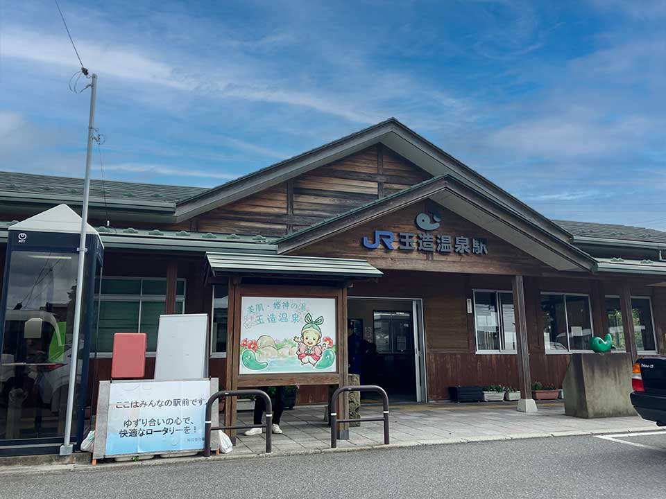 『玉造温泉駅』は松江市玉湯町湯町にあるJR山陰本線の駅です。山陰地方屈指の温泉どころ、玉造温泉への玄関口のため、特急「やくも」「スーパーまつかぜ」および「スーパーおき」が一部停車します。1909年(明治42年)に山陰本線松江駅〜宍道駅間延伸により、『湯町駅』として開業しました。1949年(昭和24年)に現在の玉造温泉駅に改称。2012年(平成24年)に屋根が玉造温泉内の玉作湯神社をイメージした銅板ぶきにリニューアルされ、2014年(平成26年)に駅前広場が完成。現在は無人化となり、自動券売機とみどりの券売機(クレジットカード専用)を利用することができます。駅前の道路(県道194号玉造温泉停車場線)を約200m歩いた交差点に一畑バス「玉造温泉駅入口」停留所があります。また駅周辺には「松江市役所玉湯支所」「湯町簡易郵便局」が位置しています。