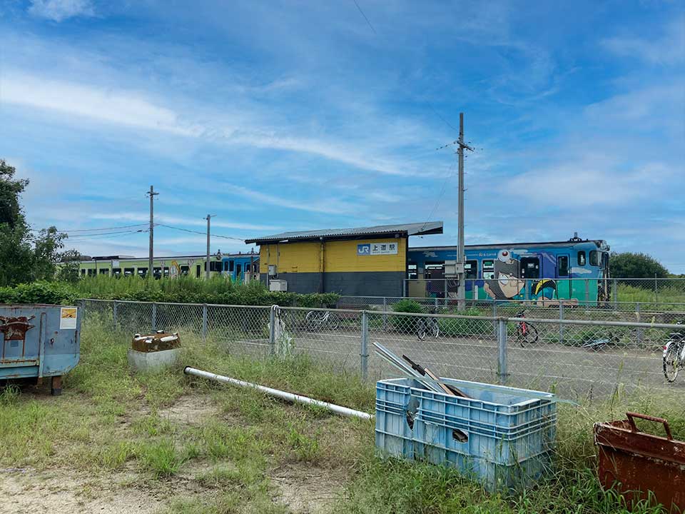 『上道駅』は境港市中野町にあるJR境線の駅です。妖怪の名前から付けられた愛称は「一反木綿駅」。この妖怪は空を舞う白い反物の形の妖怪で、道行く人の首に巻きついたり、ぐるぐる巻きにして連れ去ったりします。1952年(昭和27年)に開業しました。境港方面に向かって右側に単式ホーム1面1線を有する地上駅(停留所)。米子駅管理の無人駅で駅舎はなく、ホームの境港寄りの出入口から直接ホームへ入ることができます。以前はその出入口付近に乗車駅証明書発行機が設置されていましたが、現在も自動券売機は設置されていません。駅周辺にはクリニックや飲食店があるほか、「境港市文化ホール シンフォニーガーデン」「境港市民体育館」「境港市民温水プール」といった施設が揃っています。また、駅前にはバス停があり、地域の生活路線バスが発着しているので便利です。