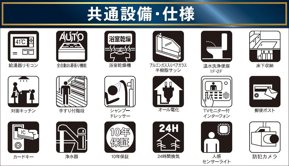 - コンロ種別IH システムキッチン 追炊機能 シャワー付洗面化粧台 床下収納 洗濯機置き場室内 バルコニー フローリング TVドアホン 温水洗浄便座 オール電化 カウンターキッチン 浴室乾燥機 クローゼット有 設計住宅性能評価書有 フラット35・S適合証明書有 耐震基準適合証明書有 建設住宅性能評価書(新築時)有 建築確認完了検査済証有 浄水器・活水器 24時間換気システム ワイドバルコニー 複層ガラス・複層サッシ