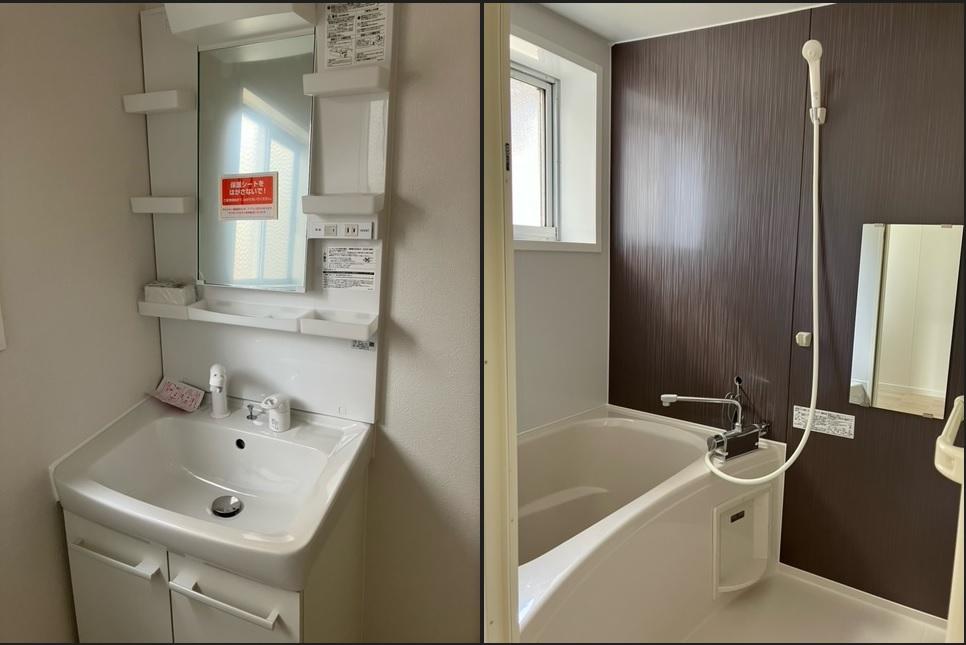 - 給湯 追炊機能 シャワー付洗面化粧台 洗濯機置き場室内 専用庭 フローリング 温水洗浄便座 テラス